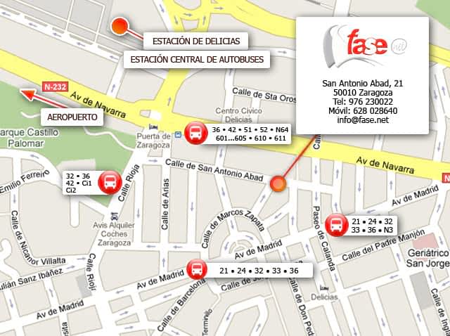 Recomendamos a nuestros alumnos desplazarse en transporte público urbano, ya que tenemos más de 10 líneas de autobús próximas a nuestras instalaciones, tal y como detallamos a continuación: